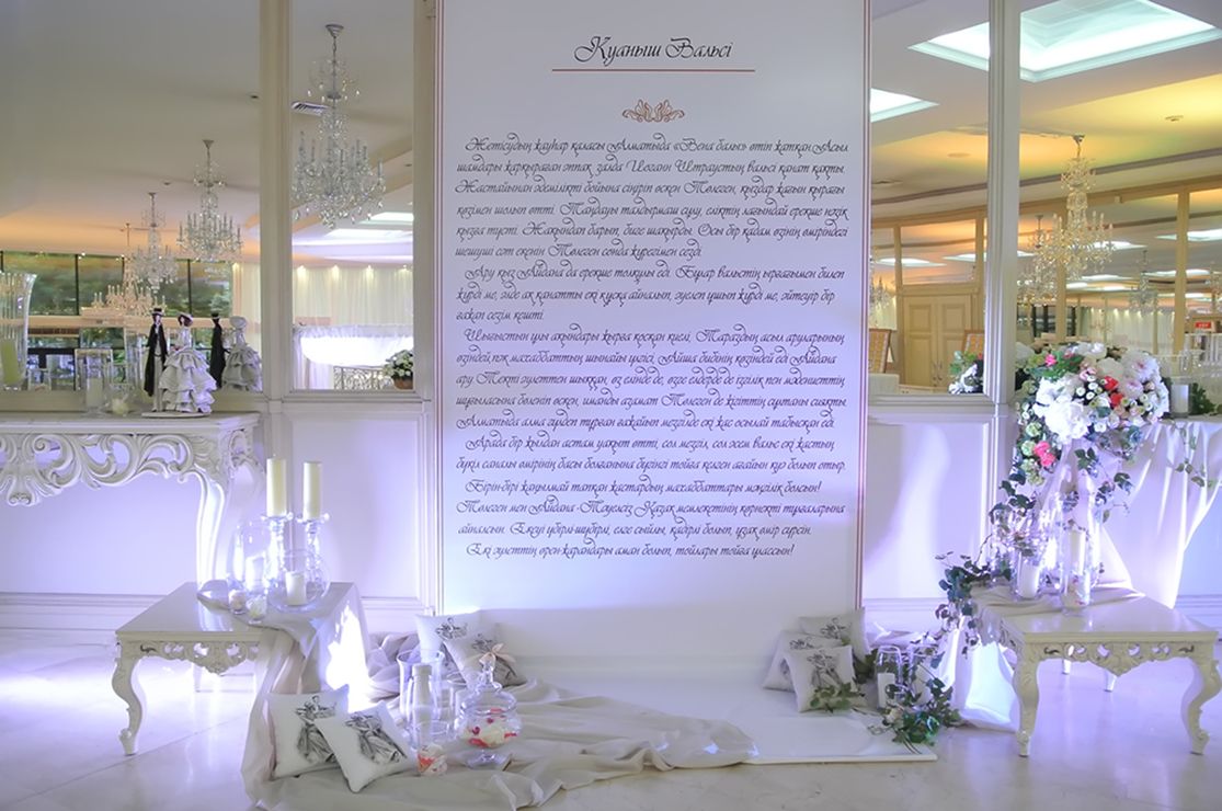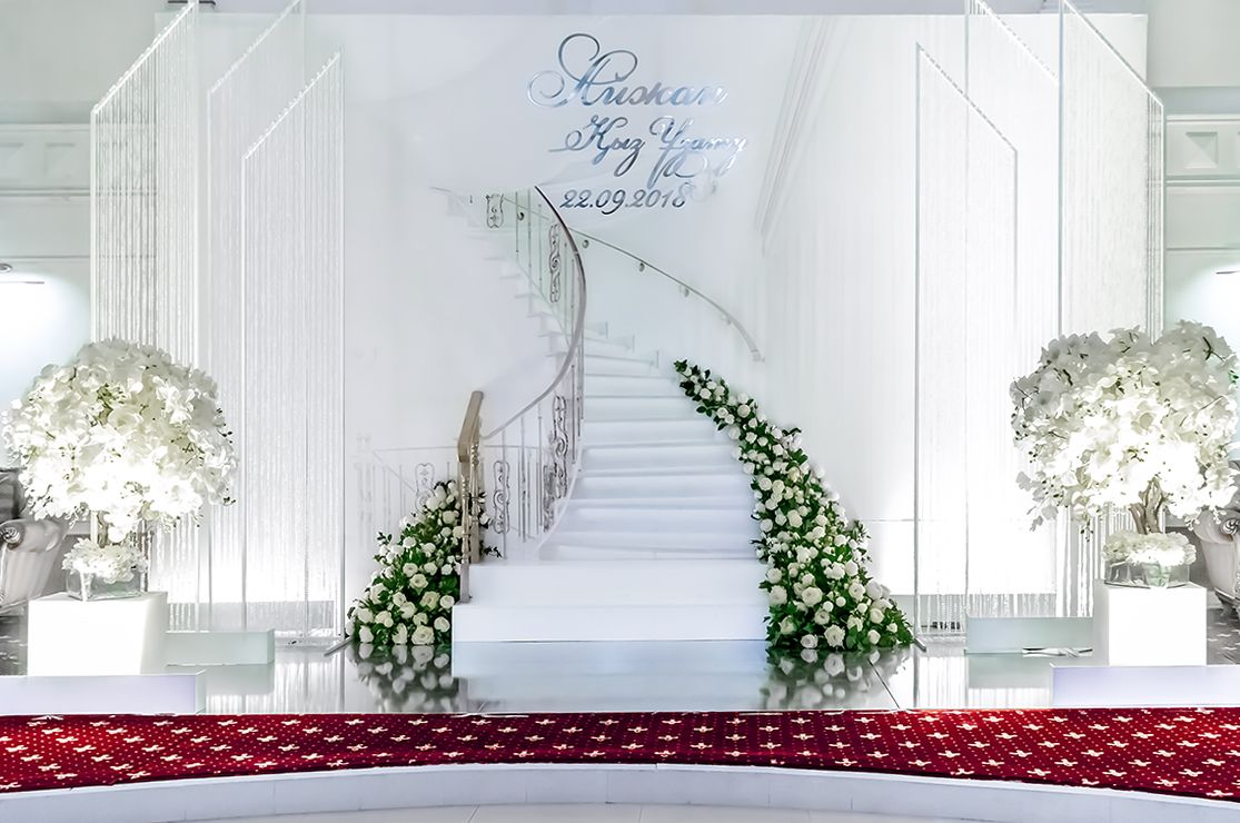 Стиль свадьбы определила большая открытая площадка на территории банкетного зала Малого Дома Приемов. Здесь расположена белоснежная колоннада и лестница, зеленая лужайка в окружении розовых кустов – чудесная картина, и дополнил ее бело-зеленый цветочный декор. Чтобы подчеркнуть атмосферу легкими штрихами, мы выбрали изящные прозрачные стулья, камерный оркестр, развивающийся шатер.