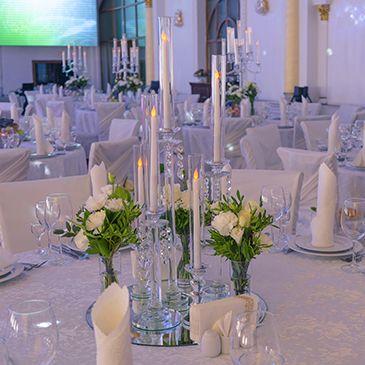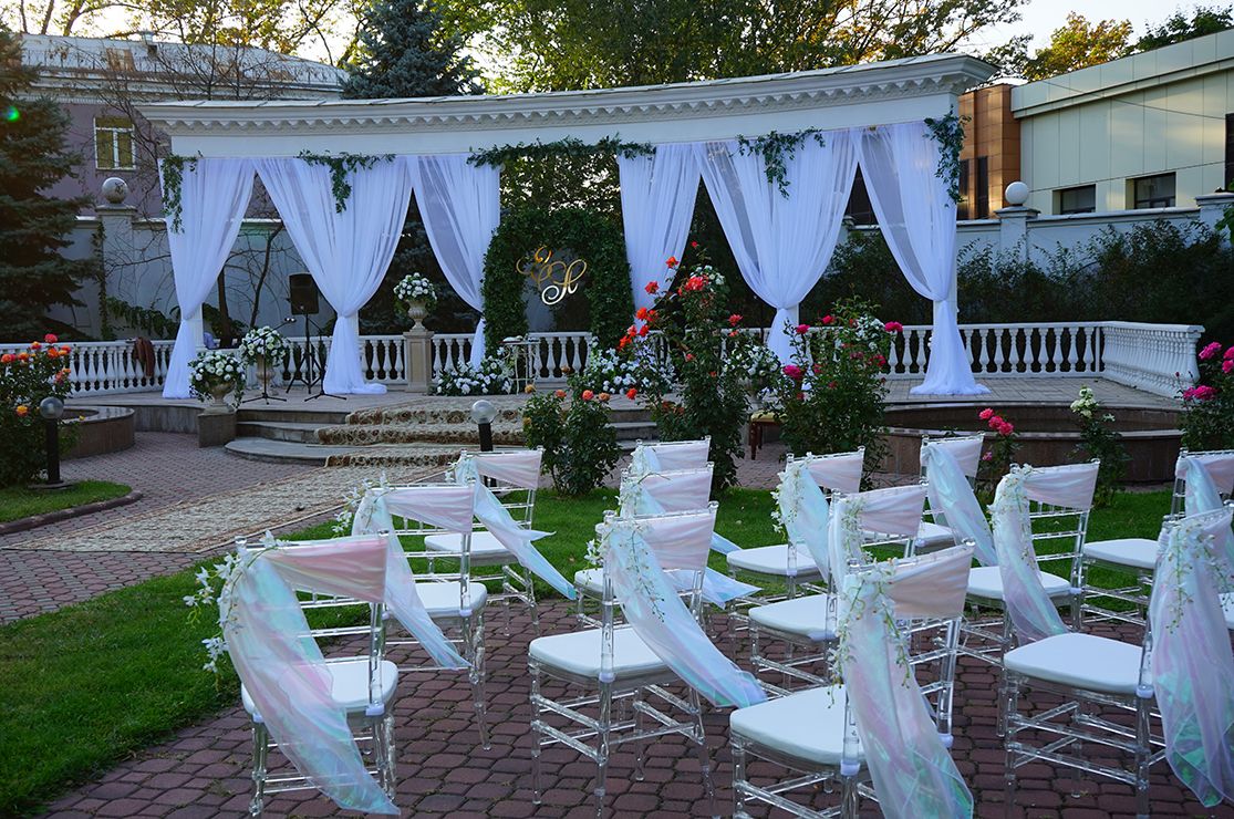 Стиль свадьбы определила большая открытая площадка на территории банкетного зала Малого Дома Приемов. Здесь расположена белоснежная колоннада и лестница, зеленая лужайка в окружении розовых кустов – чудесная картина, и дополнил ее бело-зеленый цветочный декор. Чтобы подчеркнуть атмосферу легкими штрихами, мы выбрали изящные прозрачные стулья, камерный оркестр, развивающийся шатер.