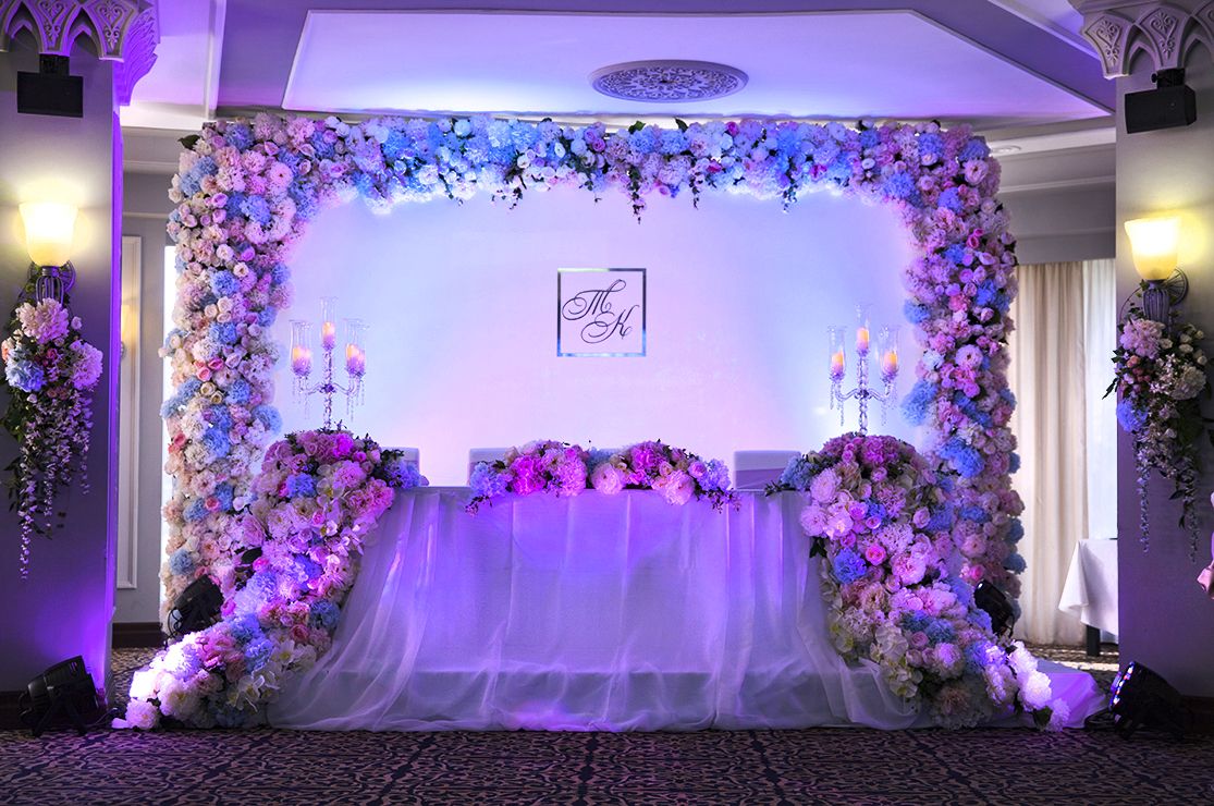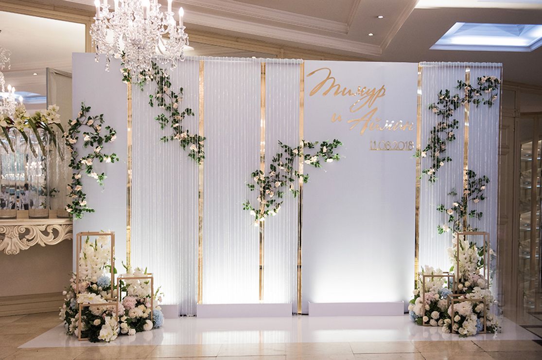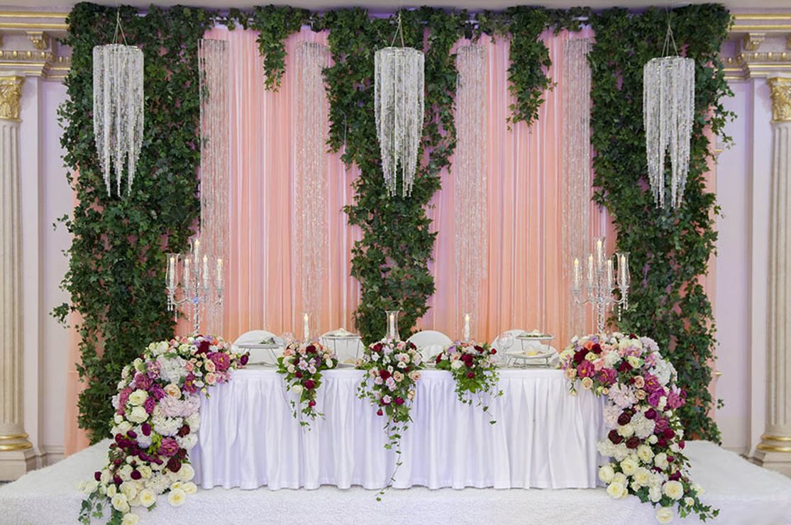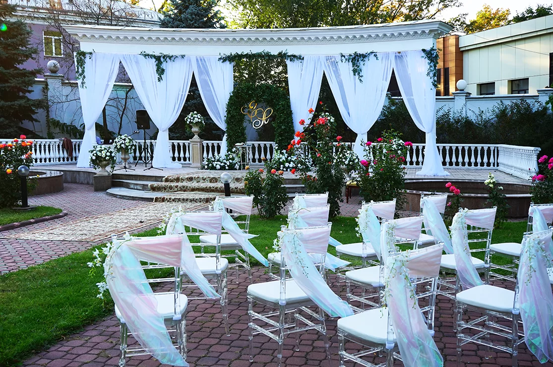 Стиль свадьбы определила большая открытая площадка на территории банкетного зала Малого Дома Приемов. Здесь расположена белоснежная колоннада и лестница, зеленая лужайка в окружении розовых кустов – чудесная картина, и дополнил ее бело-зеленый цветочный декор. Чтобы подчеркнуть атмосферу легкими штрихами, мы выбрали изящные прозрачные стулья, камерный оркестр, развивающийся шатер.