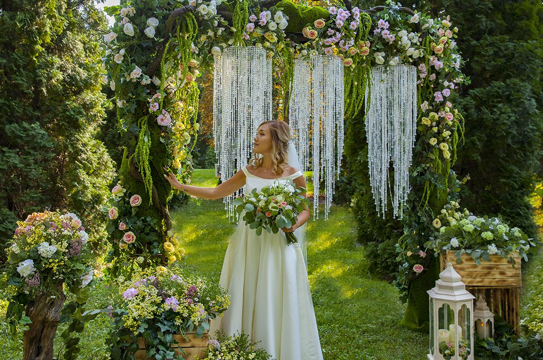 Мы создали для них пространство, где много зелени, стильные природные акценты и много натуральных материалов. Необыкновенно красивый антураж, гармония между парой и природой – все, как и мечтали молодые люди.