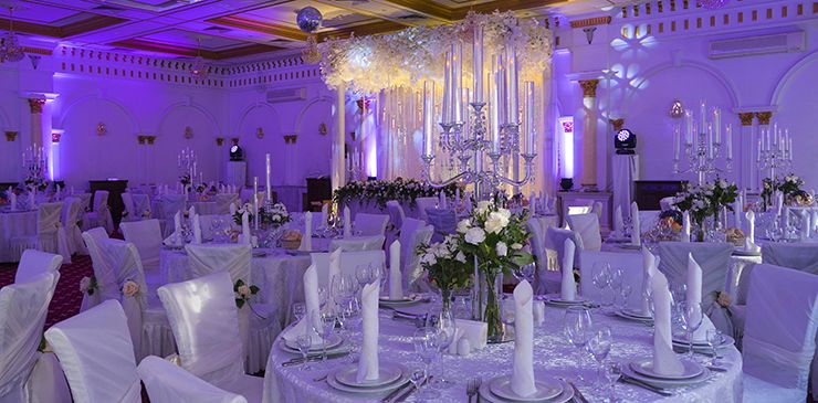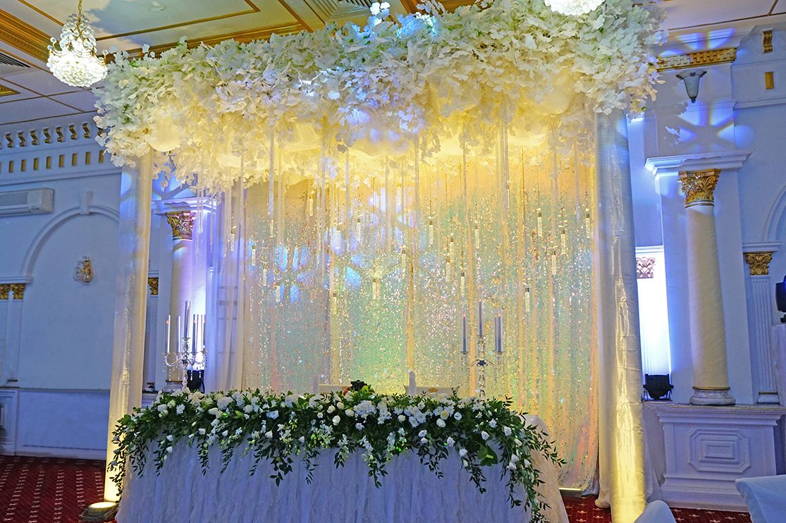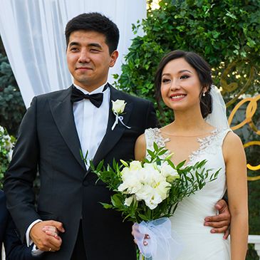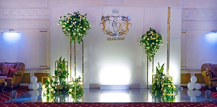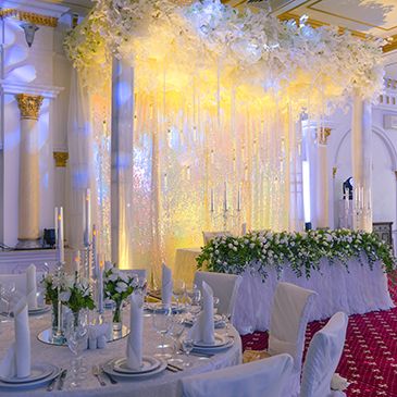 Стиль свадьбы определила большая открытая площадка на территории банкетного зала Малого Дома Приемов. Здесь расположена белоснежная колоннада и лестница, зеленая лужайка в окружении розовых кустов – чудесная картина, и дополнил ее бело-зеленый цветочный декор. Чтобы подчеркнуть атмосферу легкими штрихами, мы выбрали изящные прозрачные стулья, камерный оркестр, развивающийся шатер.
