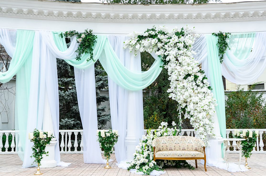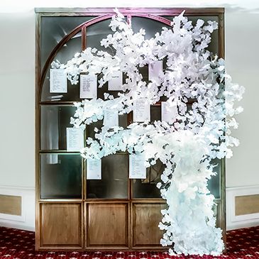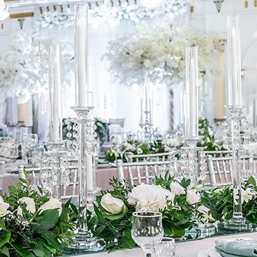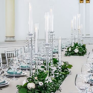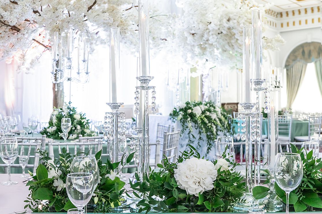 Зал утопал в цветущих деревьях, изысканные канделябры и свечи создавали причудливую игру света, живые цветы на столах дополняли праздничный декор.