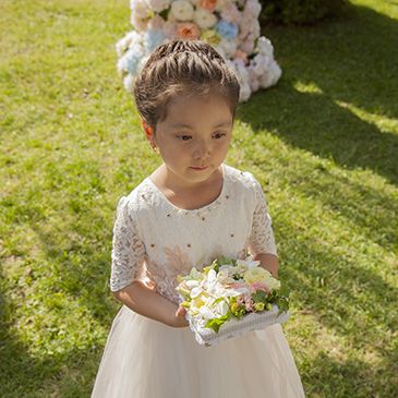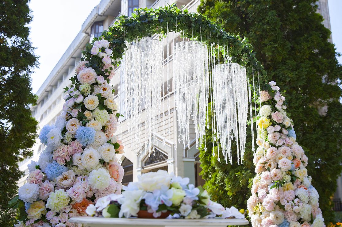 Невесомые хрустальные люстры превращаются в свадебные колокола. Их тонкий перезвон, сияющие на солнце кристаллы, белоснежный текстиль и дорога цветов – все эти детали превратили праздник в волшебную, трогательную церемонию.